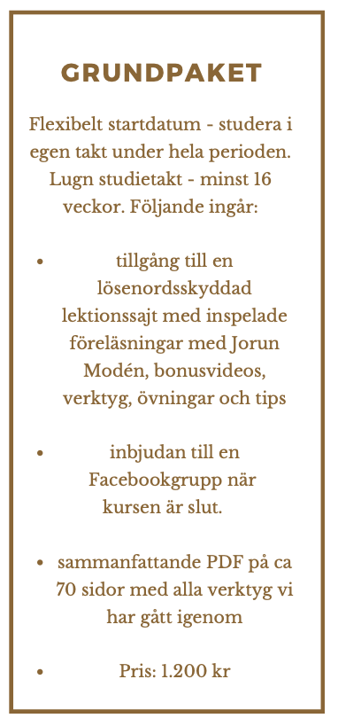Grundkursen är flexibel, du studerar och skriver på dina egna tider. Räkna med att du behöver lägga 2 – 10 timmar i veckan beroende på ambitionsnivå och individuell studietakt. Jag vill att kursen ska vara så givande som möjligt för dig så tveka inte att höra av dig!