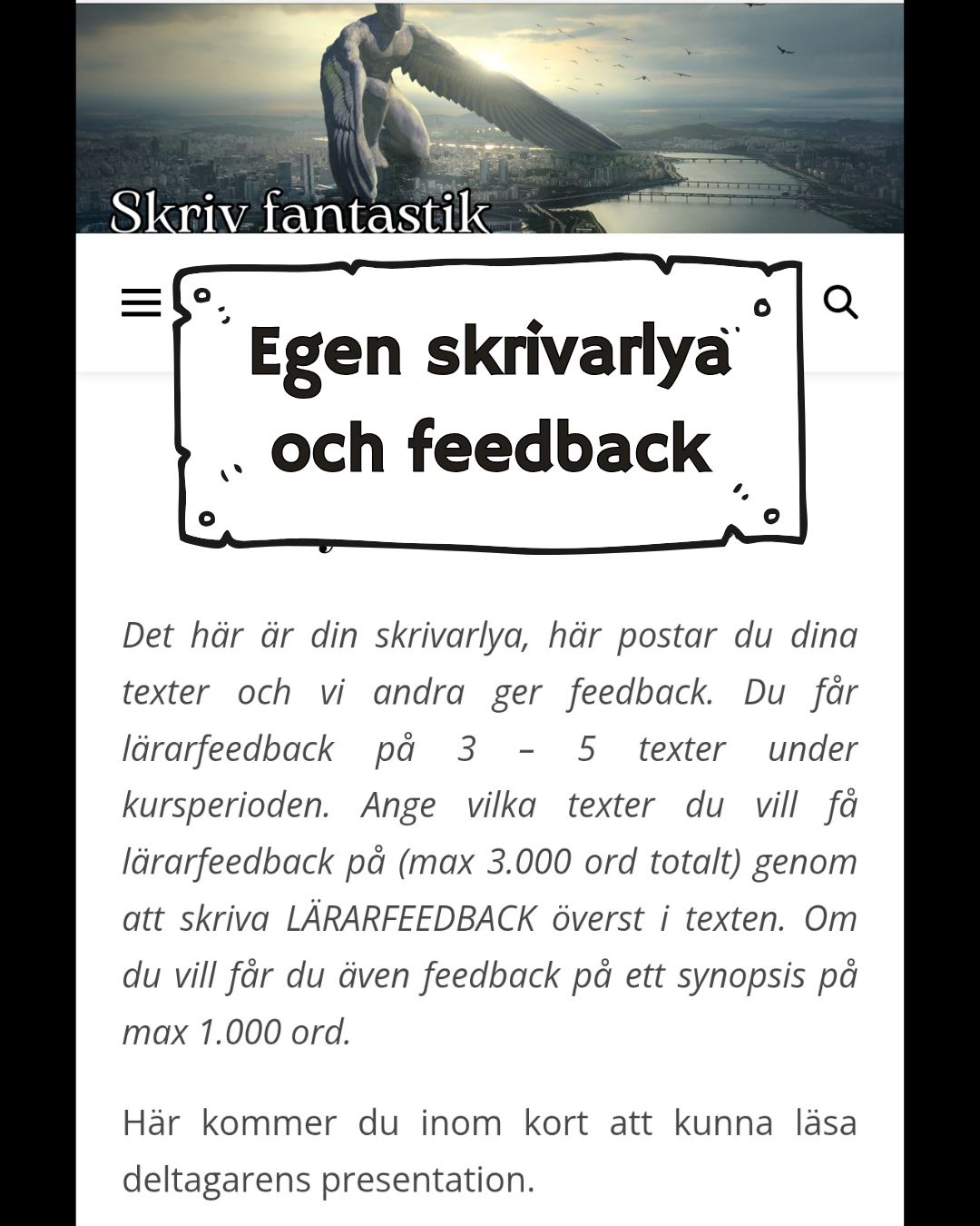 Välkommen att presentera ditt skrivprojekt - eller att sätta igång med ett nytt. Vi jämför olika utgångspunkter och teman för att skriva fantastik. Vi hjärnstormar, fyller idégarderoben och leker med tekniker för att flödesskriva, till exempel att skrivsprinta. Välja målgrupp, perspektiv och tempus.