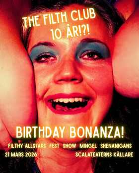 Så, den 21 mars blir det dubbelt kalas. Först och främst för The Filth Club som vid det här laget har blivit ett eget väsen. En varelse med världens bästa publik! Sonja har bjudit in sina favoritakter från dessa 10 år och det blir en kavalkad av svettpärlor från landets bästa undergroundartister.